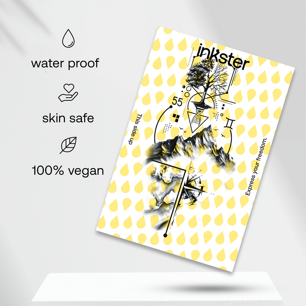 Für dein revolutionäres 2-Wochen-Tattoo von Inkster brauchst du nur das Tattoo, das du an deine Haustür geliefert bekommst. Eine Anleitung, wie man das Tattoo anbringt, befindet sich auf der Tattoo-Verpackung. Keine Sorge, es ist so einfach, nichts kann schief gehen!